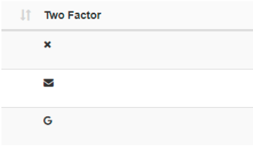 [カラムの表示]ボタンを使用して、[ユーザー]グリッドに2要素認証列を追加します。これにより、2要素認証に関して設定されたユーザーの設定状態が表示されます。(上から順に、オフ/メール/Google認証)